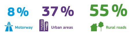 Ένα άλλο επίσης ενδιαφέρον στοιχείο που παρουσιάζεται στην έκθεση είναι ότι μόλις το 8% των θανατηφόρων ατυχημάτων λαμβάνουν χώρα στους αυτοκινητόδρομους. Το 37% συμβαίνει σε αστικές περιοχές ενώ το μεγαλύτερο ποσοστό συμβαίνει σε περιφερειακό- επαρχιακό δίκτυο.