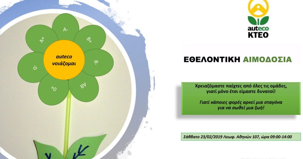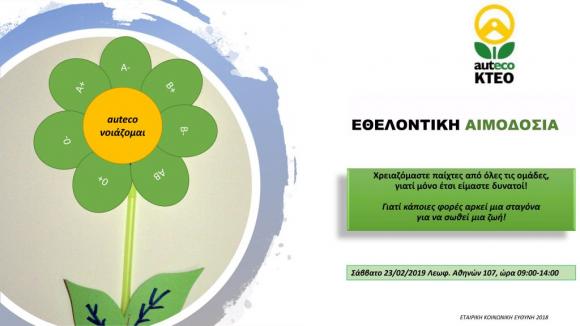 Το Σάββατο 23/02/2019 από τις 9.00-13.00 θα πραγματοποιηθεί Εθελοντική Αιμοδοσία στον κεντρικό σταθμό της Auteco επί της Λεωφόρου Αθηνών 107 και στην οποία θα συμμετέχουν οι εργαζόμενοι της εταιρείας, καθώς και όποιος από τους συμπολίτες μας το επιθυμεί.